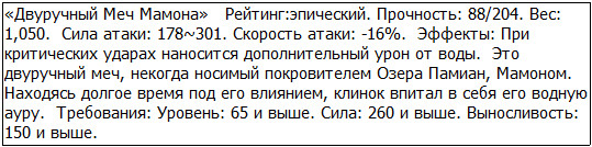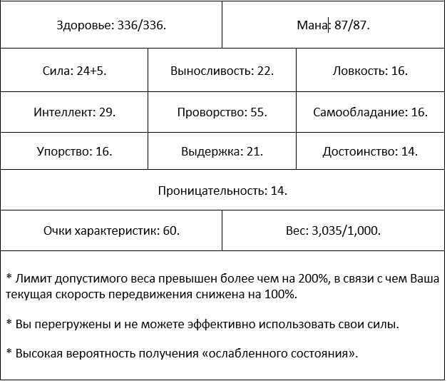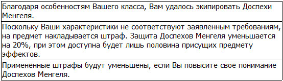 Из-за своих невысоких текущих характеристик я всё ещё не отвечал требованиям, позволяющим использовать Двуручный Меч Мамона и Доспехи Менгеля. В связи с эти игровая система накладывала на клинок штраф в виде 30-процентного падения силы атаки, в то время как на доспехи – 20-процентное уменьшение показателей защиты.