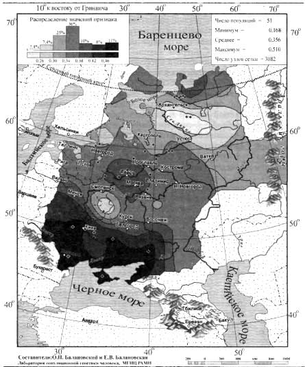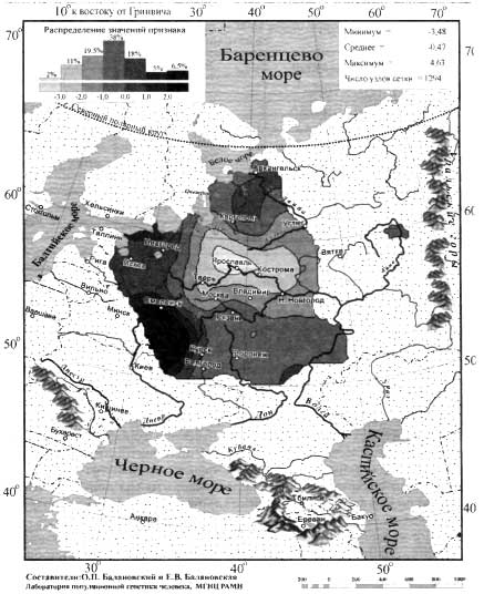 Для получения среднерусских характеристик оцениваются средние (невзвешенные по численности каждой русской популяции) значения по всем исследованным популяциям. Получается характеристика абстрактной «среднерусской» популяции, от которой и вычисляются генетические расстояния до всех точек карты.
