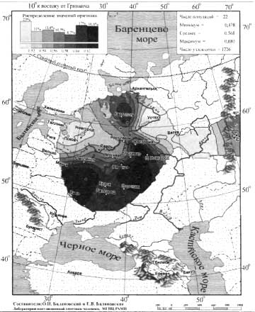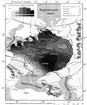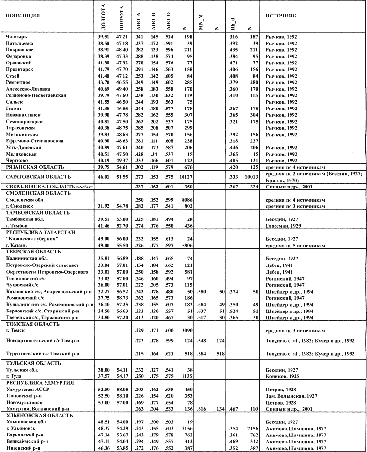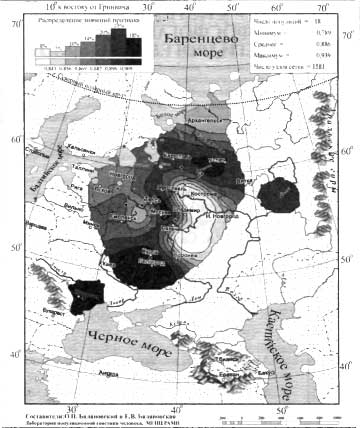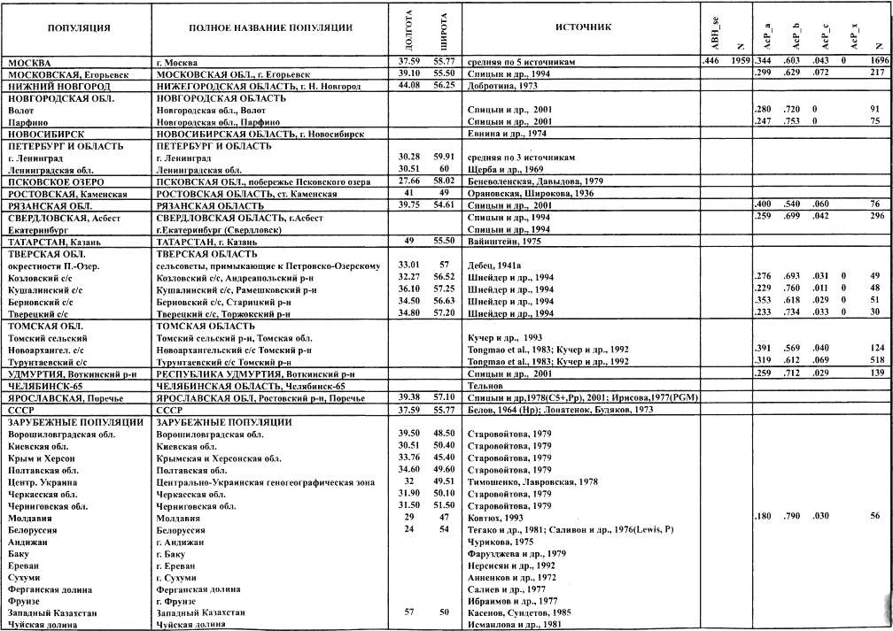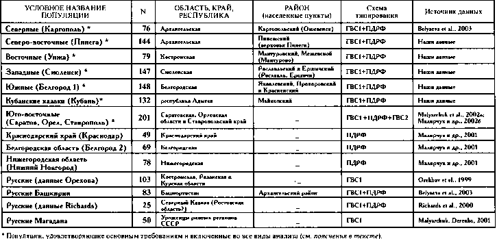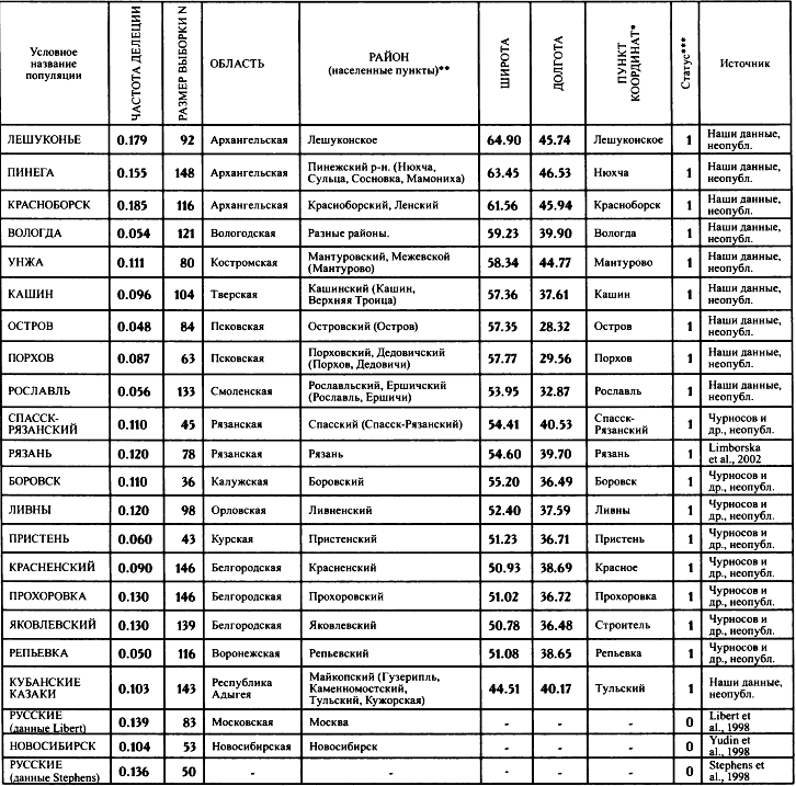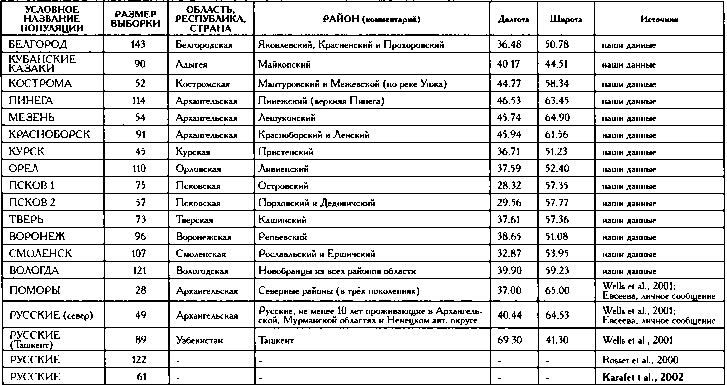 Едва ли не важнейший свидетель — физическая антропология. Именно работа антропологов [Происхождение…, 1965] была первым исследованием русского генофонда, проведённым под руководством Татьяны Ивановны Алексеевой и Виктора Валерьяновича Бунака. Лишь полвека спустя генетики смогли добавить к этому свои данные. Вопросы взаимодействия антропологии и генетики были для Татьяны Ивановны столь важны, что мы вместе проводили экспедиции и семинары генетиков и антропологов. И авторы всегда будут благодарны ей за поддержку и интерес к геногеографии. Хотелось бы, чтобы и настоящее исследование, объединяющее антропологические и генетические данные, послужило её светлой памяти.