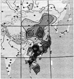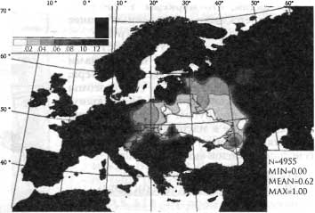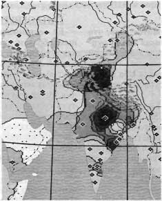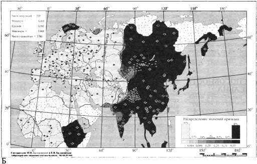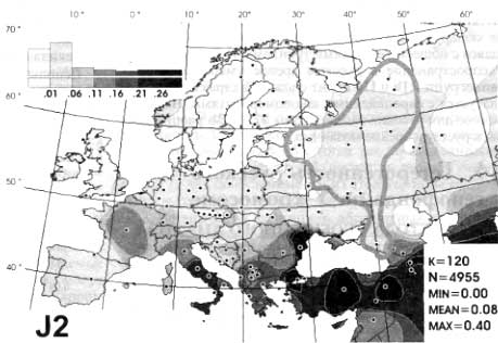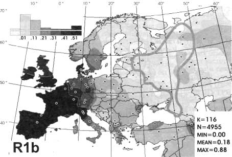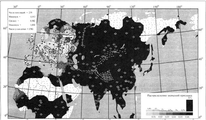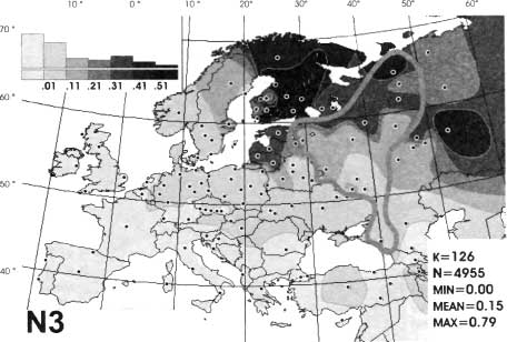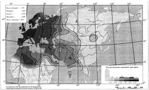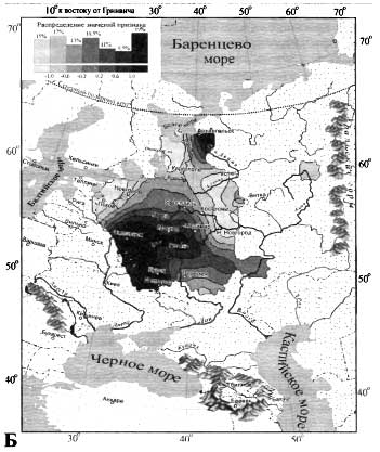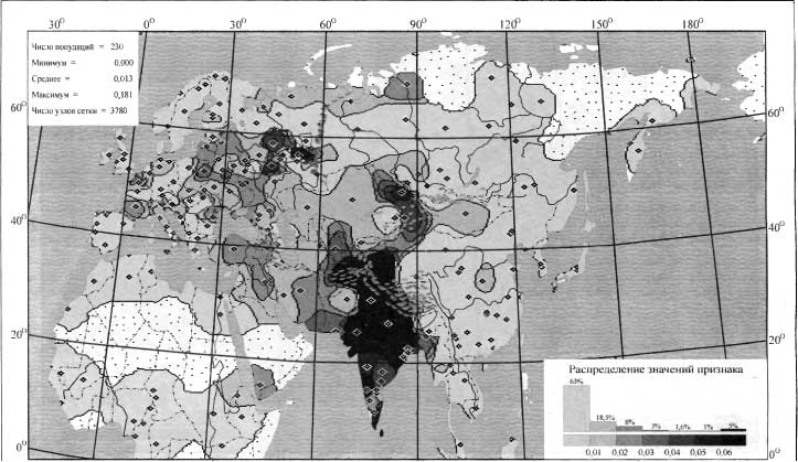 Положение «границы между Западом и Востоком» несколько по-разному вырисовывается в нескольких разных исследованиях [Генофонд и геногеография…, 2003; Cavalli-Sforza et al., 1994; наша книга]. Подробно это обсуждается в следующем разделе, посвящённом географии главных компонент. Пока же отметим, что ход границы по мтДНК зависит ещё и от того, какие гаплогруппы мы причислим к западно-евразийским, а какие — к восточным. Главная сложность — гаплогруппы, специфичные для Индостана. Мы причисляем их к западным на том основании, что другие (не специфические) индийские гаплогруппы почти все являются западными.