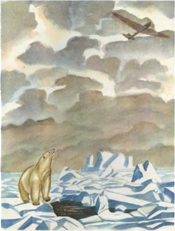 Пришлось продолжать полёт, управляя самолётом по приборам — «вслепую». Хуже было другое: во влажной облачности самолёт обледеневал — на его крыльях, фюзеляже, воздушном винте начала нарастать толстая ледяная корка. Самолёт, отяжелев, проваливался вниз, дрожал, стал хуже слушаться рулей… С большим трудом удавалось лётчикам выбираться из облаков наверх, где солнышко своими тёплыми лучами растапливало лёд и машина снова становилась летучей и хорошо управляемой. Так повторялось несколько раз.