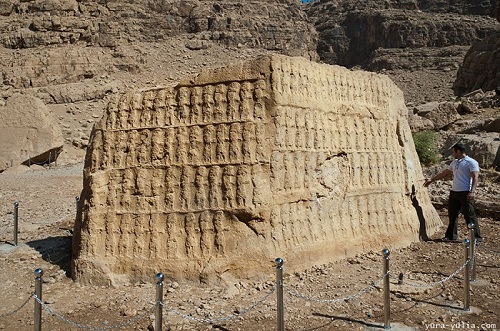 К находкам эламской культуры, добытым при раскопках, следует присовокупить сохранившиеся в этих местах наземные памятники. Сюда относится целый ряд наскальных рисунков в Бахтиарских горах, особенно в районе Изех (прежнее название — Маламир) и вблизи Фахлиана. Первый европеец, отважившийся посетить эти отдаленные места, был англичанин А. X. Лейард. Вовремя своих опаснейших научных экспедиций в 1840—1842 гг. он неоднократно подвергался ограблениям. Лейард открыл многочисленные наскальные памятники, фотокопии с которых были сделаны лишь в 1962 г. бельгийским археологом Л. Ванден Берге (Женева). Самый значительный древнеэламский наскальный рисунок был обнаружен в 1924 г. Эрнстом Херцфельдом (Берлин) в Курангане вблизи древнейшей военной дороги Сузы — Персеполь, по которой в 330 г. до н.э. Александр Македонский проник в самое сердце Южного Ирана. Другой рельеф, относящийся, по всей вероятности, к среднеэламской истории, был случайно обнаружен в 1936 г. во время пребывания в Калейе Толл, южнее Изеха, сэра Орела Штайна. Затем рельеф был забыт и только 5 марта 1963 г. снова мною обнаружен. С него была сделана фотокопия, после чего он был бережно повернут надписью к земле в ожидании возможности переправки его в музей.
