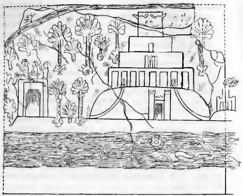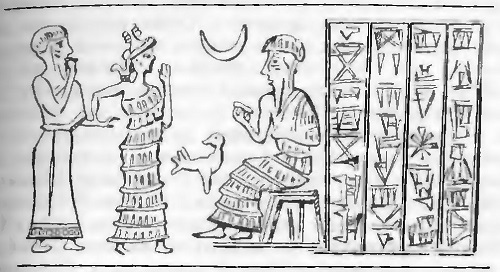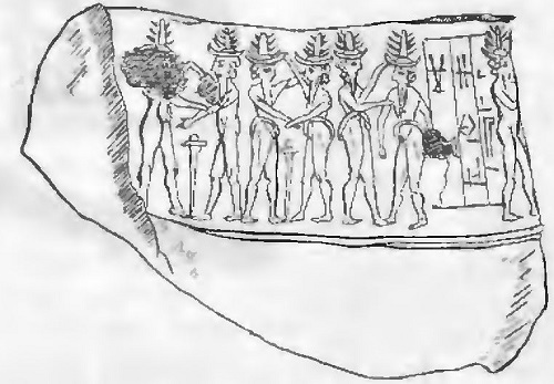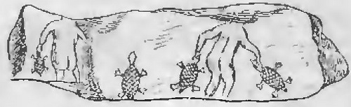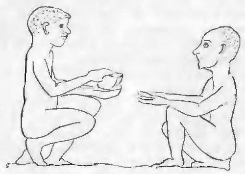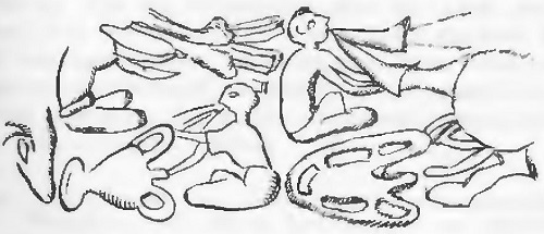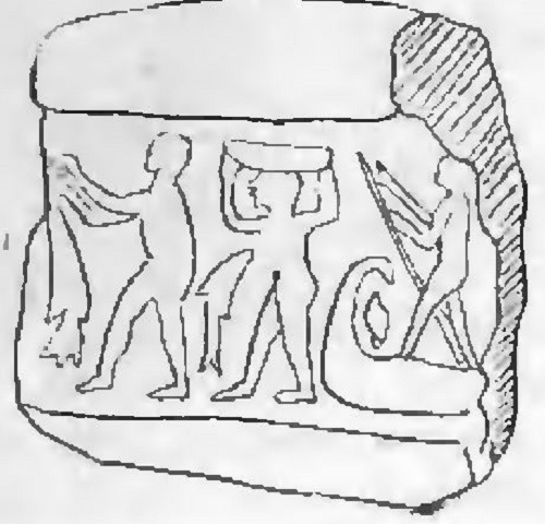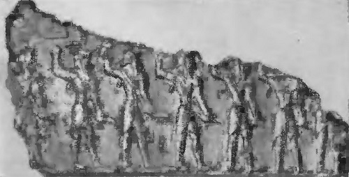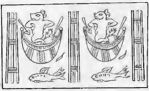 На одной из печаток мы видим, как совершенно обнаженные рыбаки достают из воды черепах гигантских размеров (рис. 4), на другой — эламит вытаскивает на берег свою лодку с красиво загнутым носом (рис. 5). Хозяин лодки, вышедший уже на сушу, держит в руках прекрасный улов — два больших усача; за ним следует его подручный, неся на голове блюдо, наполненное доверху рыбешкой.