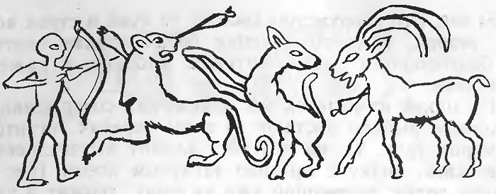 Ландшафт Сузианы изображен на печатях в виде извивающихся водотоков, в которых плавают рыбы. Высоко в горах среди сосен, кедров и хвойных деревьев резвятся буйволы, горные козы и козлы. Разные животные обитают в степи или в кустарнике; они, то мирно пасутся, то спасаются бегством от льва. А вот появляется эламский охотник (рис. 2 и 3). Вся его одежда состоит из набедренной повязки, а часто он обходится и без нее. Его вооружение состоит из лука и стрел, копья или топора. В сопровождении собак эламит охотится на благородного оленя, антилоп, кабанов и даже на хищников.
