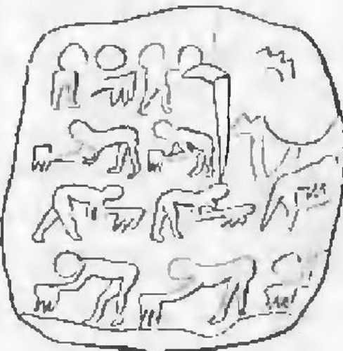 Наибольшее оживление возле зернохранилищ. Печати воспроизводят зернохранилища в виде постройки из кирпича-сырца с длинным рядом куполов Фасад расчленен нишами, над которыми под горизонтальной крышей расположены узкие люки для проветривания хранилищ. Работники возятся с мешками или кувшинами. Они носят свои тяжести на голове или плече, поднимаясь к отверстиям в куполах на лестницах-стремянках или пристроенных сбоку лестничных маршах (рис. 13). Цоколь изолировал хранилища от земли. Однако были и зернохранилища, наполовину размещенные в земле. Об этом свидетельствует найденный в Сузах математический текст. Рядом с хранилищами сидят на корточках писцы и записывают на глиняных табличках сданное количество зерна (рис. 14). На корточках сидят и смотрители винного погреба, разливая вино по сосудам и закупоривая их (рис. 15).