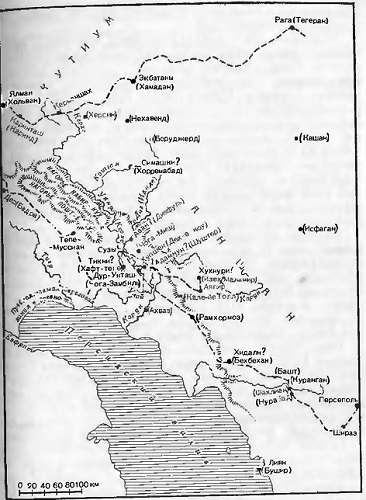 [9]. Хузийцы принадлежали, вероятно, к эламским племенам, известным грекам Александра Македонского как уксии, которые причиняли им немало неприятностей. Горные уксии населяли землю между Бехбеханом и Фахлианом и контролировали, таким образом, дорогу Сузы — Персеполь. Когда они по привычке потребовали от войска Александра Македонского уплаты пошлины за проход по этой дороге, им было отказано. Хотя и с большим трудом, войску в конечном счете все же удалось пробить себе путь через эту область.
