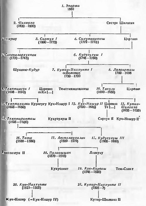 Из письменных источников известно, что лишь Шилхак-Иншушинак (XII в. до н.э.) женился на вдове своего брата Кутир-Наххунте II. Это делалось для того, чтобы сохранить власть за собой и своими детьми. Нет никаких письменных сведений о том, что вдова Кутир-Наххунте II была сестрой обоих правителей. Брак на вдове брата свидетельствует о наличии в Эламе обычая левирата. Обычай левирата во все времена был широко распространенным явлением на Востоке. При левирате состояние покойного брата вместе с женой и детьми переходило в состав хозяйства здравствующего брата. Исторически же обычай левирата преследовал цель сохранения хозяйственной целостности домашней общины. Женитьба правителя на вдове своего брата — предшественника на троне имела целью сохранить за собой власть (прим. ред.).