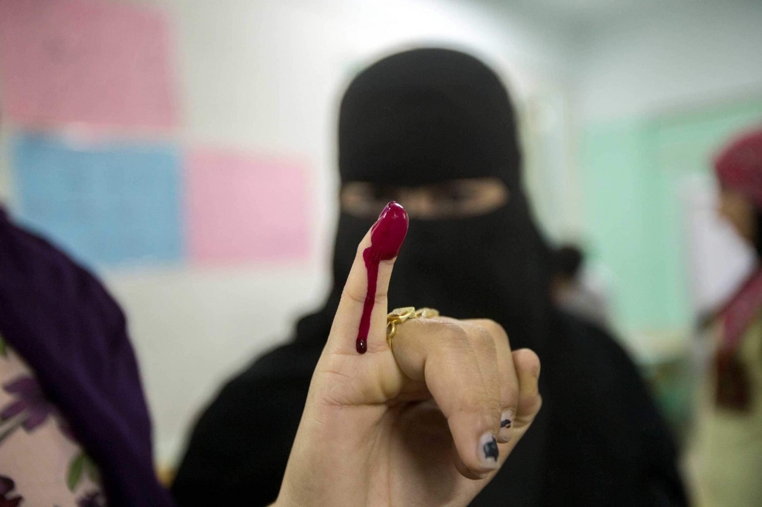 LEFT: The portrait of candidate Abdel Fatah al-Sissi placed on a flag being sold by street vendors outside a polling station in a Cairo suburb in May 2014. (Jonathan Rashad/Getty Images) RIGHT: A woman’s painted finger signifies that she voted in Egypt’s presidential election in March 2018. Sissi could soon have the authority to rule until 2034. (Salah Malkawi/Getty Images)