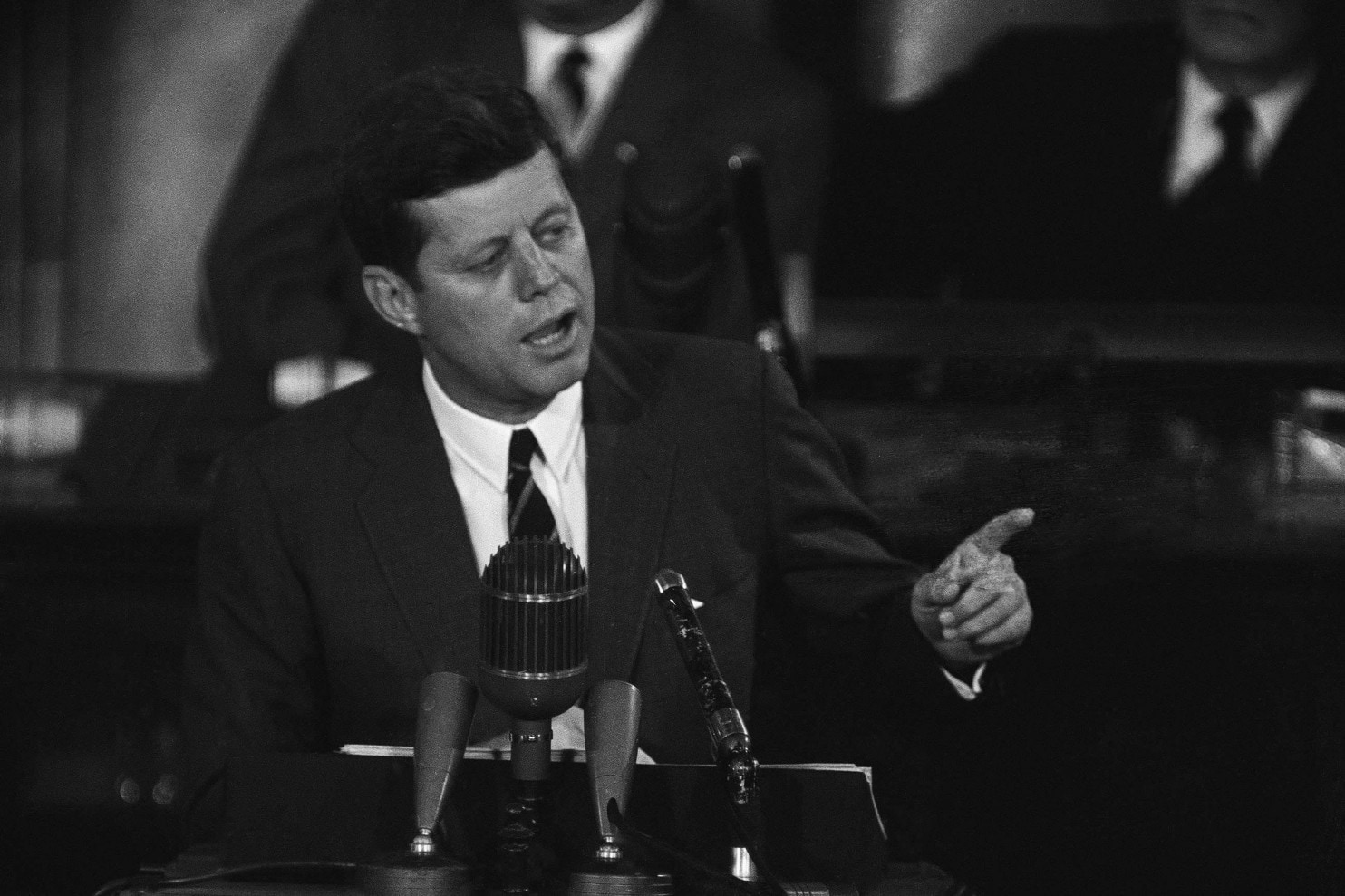 LEFT: Soviet Premier Nikita Khrushchev at the United Nations in New York in October 1960. RIGHT: President John F. Kennedy speaking to a joint session of Congress in May 1961. (Associated Press photos)