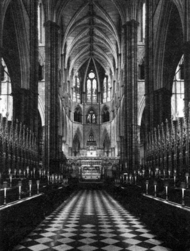 Стоя на средокрестье, там, где сходятся неф и трансепт, мы все еще не имеем полного впечатления от главного нефа в целом. В архитектурном выражении неф — это длина церкви от западной ее стороны до средокрестья, а хоры — ее протяженность от средокрестья до восточной стороны. Однако литургия предполагает иное восприятие Вестминстерского аббатства. Хоры, отделенные с западного нефа от остального пространства церкви каменной алтарной преградой — пульпитумом, по обеим сторонам которых расположены скамьи для духовенства и певчих, продолжают западную часть средокрестья, разделяя неф на две неравные части. Такая модель обычна для бенедиктинской церкви. Как мы уже отмечали, аббатство, в отличие от большинства других английских соборов, не имеет ярко выраженной вытянутости западной части церкви до средокрестья. Следовательно, мы находимся в фокусной точке, в пересечении четырех ответвлений приблизительно равной длины. И есть лишь одна ось, пересекающая неф, святилище и трансепты в средокрестье, — вертикальная ось, поднимающаяся от пола до уровня свода и далее — до башен. Величайшие французские соборы чаще всего не имеют центральных башен, и свод средокрестья обычно той же высоты, что и остальные. Самое выдающееся исключение — Руанский собор, здание, демонстрирующее английское влияние в архитектуре. С другой стороны, несколько английских соборов имеют лантерны — башни со стеклянными окнами, находящиеся выше свода над средокрестьем. Лантерны аббатства никогда не были построены — есть лишь их жалкое подобие, возведенное не раньше XVIII века, и современный расписной деревянный потолок, установленный вместо поврежденного войной, — таким образом, мы не поднимаем глаз к головокружительному пространству свода с лучами солнца, струящимися, словно благословения, с высоты небес, как это происходит в Линкольне, Кентербери или Йорке. Но и дополнительная высота обладает такого же рода эффектом.