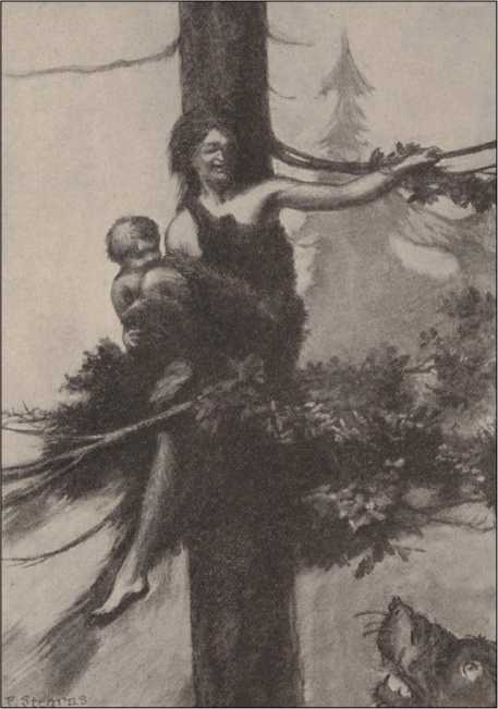 Очень близко к ним свешивалась ветвь большого букового дерева; мать перебросила дитя на свою левую руку, на аршин с лишком подскочила вверх и схватилась за ветвь правой рукой. Она висела, качаясь, а затем в одно мгновение, держа ребенка за руку, опустила его и плотно обхватила своими ногами. Если бы нам было суждено родиться в то время, то мы могли бы видеть образец прекрасного лазания. При помощи обеих свободных рук эта сильная женщина быстро взобралась вверх по спускавшейся наклонно от толстого ствола ветви на высоту около трех саженей и здесь, поднявшись в удобное место, мгновенно уселась, обхватив обеими ногами толстую ветвь, одной рукой держась за торчавшую вверх меньшую ветвь, а другой, свободной рукой крепко прижимая к груди свое смуглое дитя.