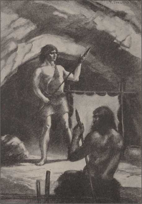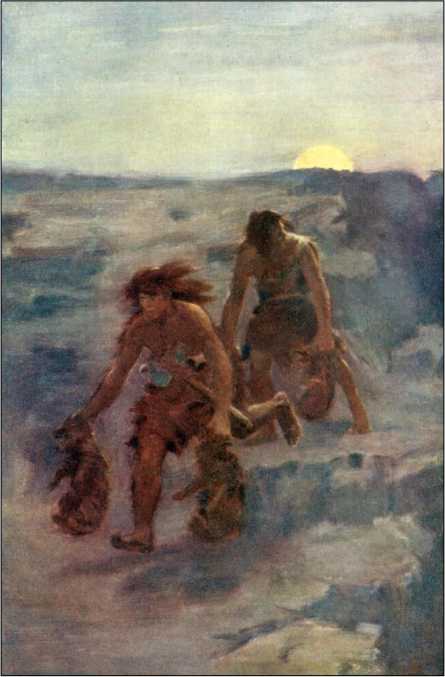 Пещерный человек обыкновенно селился так, что его убежища нависали над берегом реки, и животные, лишенные способности лазать, зачастую делались его добычей, проходя внизу по берегу. В эту эпоху люди были немногочисленны и жили очень разбросанно в лесах, и наоборот, животная жизнь была необыкновенно богата; опасность развила, однако, некоторую проницательность у более слабых животных — главной добычи человека, и они научились избегать тропинок, оказавшихся роковыми для их собратий. Зато в долинах они были сравнительно беззаботнее и паслись многочисленными стадами в надежде, что быстрые ноги спасут их от преследования хищников; но они тщательно избегали проходить под обрывом, откуда тяжелый камень, внезапно сброшенный человеком, мог принести с собой неожиданную смерть. Несмотря на обилие дичи, для пещерного человека представляло нелегкую задачу достигнуть регулярности в снабжении себя пищей; приходилось прибегать к хитростям и уловкам, и наши юноши решились воспользоваться одной из них, которая нередко увенчивалась успехом.