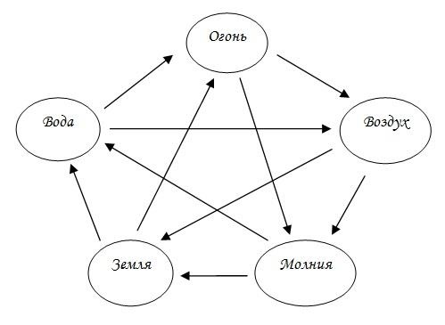 Так элементаль огня сильнее элементалей воздуха и молнии, но в то же время слабее элементалей воды и земли. Воздух сильнее молнии и земли, но слабее огня и воды…
