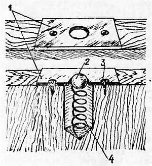 Применяются воротки подобной конструкции, но без выворачивающейся тянущей втулки. Направляющий фланец у них отлит заодно с корпусом плашкодержателя. Таким воротком сложнее работать, чем воротком с направляющим фланцем и втулкой, но легче, чем одногнездным. Самостоятельно проще всего изготовить одногнездный вороток. Корпус выточите на токарном станке или подберите обрезок толстостенной трубы. Рукоятки и опорный буртик для плашки в трубе можно приварить. Съемные рукоятки на резьбе желательны для сокращения размеров воротка при переноске. В корпусе просверлите отверстия и нарежьте в них резьбу в соответствии с имеющимися в наличии винтами. Расстояния между отверстиями выберите сообразно углублениям на наружном диаметре плашек. В эти углубления и должны войти концы винтов.
