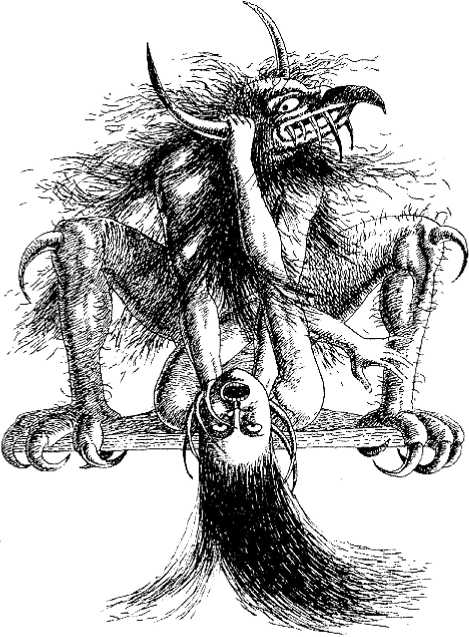 Идет Карпа дальше, сквозь стены все в избах видать — такой зоркий глаз стал. В одной избе, вишь, молодые на полатях заиграли. У молодухи-то коса длиннющая, до полу свешивается, вот окаянный ее и теребит, сам норовит заместо мужика пристроиться. А другой свекра подговаривает, нашептывает ему в уши — тот за молодыми в щелку подглядывает. Дальше идет — мужик за столом сидит, думу черную думает. А чертенок из-за штофа выглядывает, подмигивает — быть в этом дому делу черному.