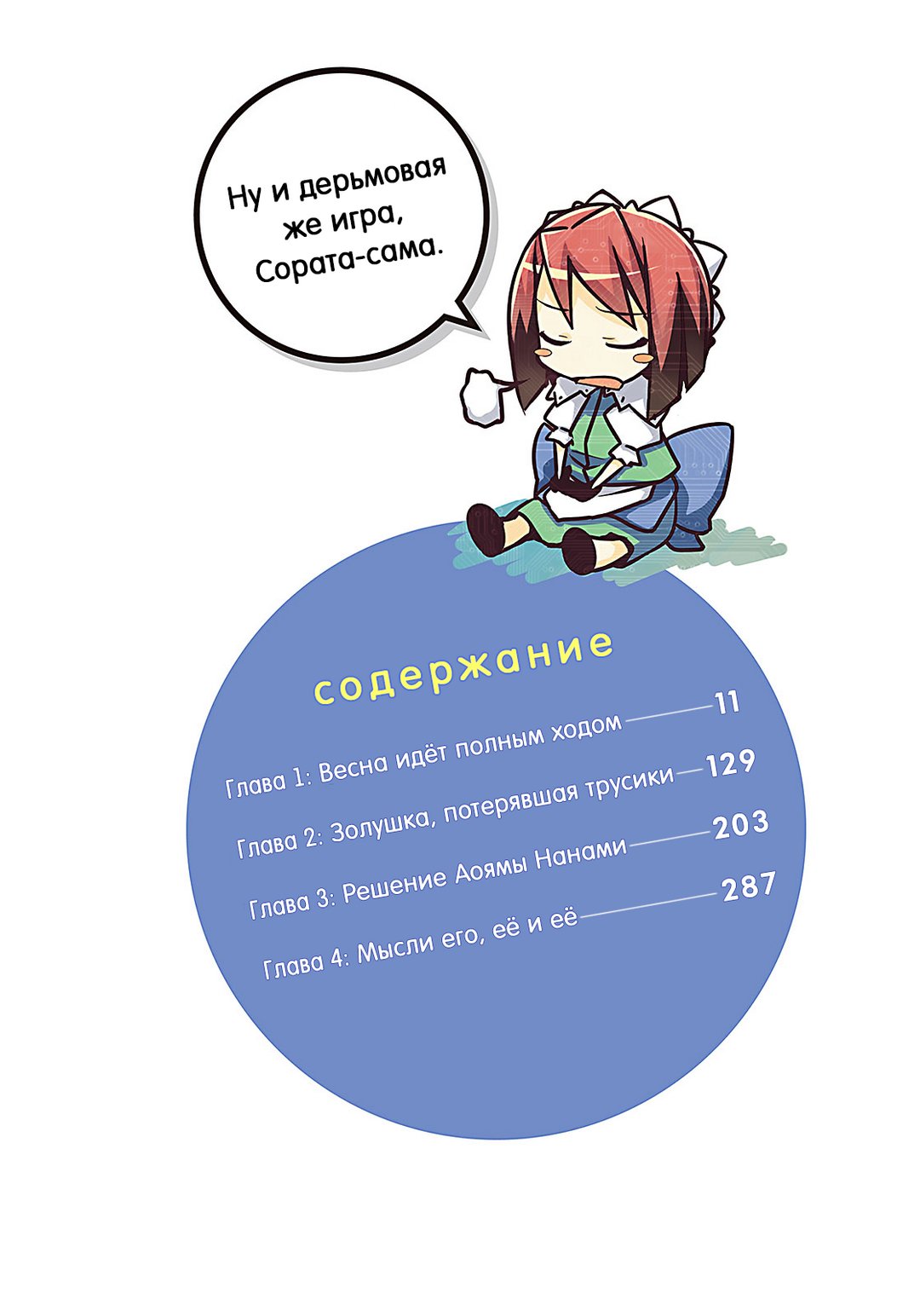 Сората протёр глаза и снова воззрился на объект перед собой. Задница. Никаких сомнений. Вот только кое-что не сходилось. Сората подумал сначала о белой кошке Хикари, но сейчас перед его носом находилась небольшая аккуратная попка Homo Sapiens. В белых трусиках.
