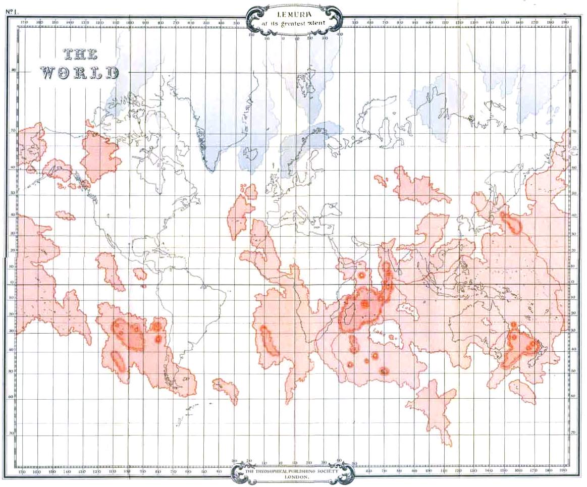 На более старой карте видно, что экваториальный материк — Лемурия — во времена своей наибольшей протяженности едва ли не опоясывал весь земной шар, простираясь от места, где в наши дни расположены острова Зелёного Мыса (Кабо-Верде), в нескольких милях от восточного берега Сьерра-Леоне, в юго-восточном направлении через Африку, Австралию, острова Общества и все прилегающие моря до точки, находящейся всего в нескольких милях от огромного островного континента (размером примерно с современную Южную Африку), который занимал остальную часть Тихого океана, включая мыс Горн и части Патагонии.