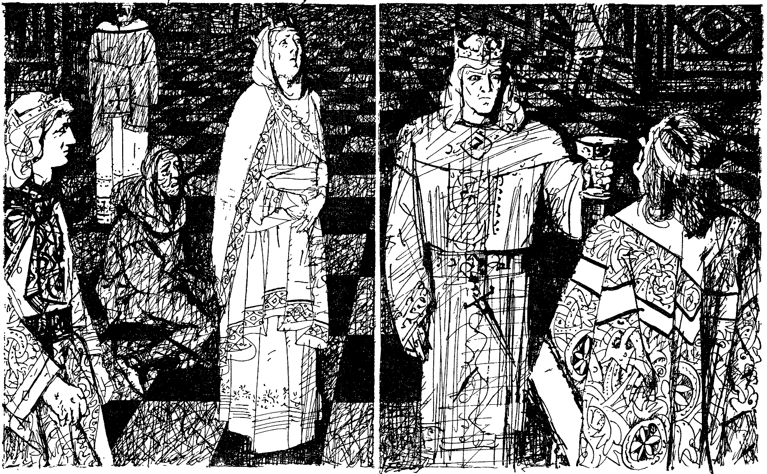 И Кривой Локоть взял с подноса, который все еще держал Роберт, злополучный кубок и хотел его вылить в раскрытую фрамугу цветного стекла. Но Заячья Губа выхватила кубок, расплескав.