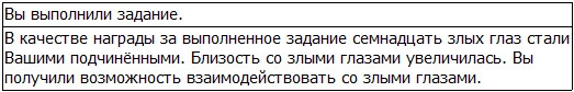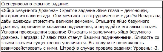 – Это человек, который помог вам сберечь яйцо безумного дракона? Я слышал, что он очень хорош как для человека… Но я сильно сомневаюсь, что он имеет право лицезреть нашего великого короля, который имеет дело с тёмным пламенем и белым льдом, а также видит правду всего мира… Мы тебе не враги, но король злых глаз – это абсолютное существо, которое одним своим взглядом отнимает у человека его жизнь и судьбу. Неквалифицированный человек, который встречает его, попадет в извечный ад и в конце концов погибает. Я должен проверить тебя. Подчинение.