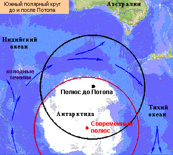 «Допотопное» же положение Южного полюса (на том краю Антарктического материка, который обращен в сторону Австралии) задает совершенно иной режим обогрева, обеспечивая в то же время и другой режим океанических течений — без замкнутого кольца холодных вод, а это вполне могло обеспечивать и то, что значительная часть Антарктиды была свободна ото льда (о чем уже говорилось), и там текли реки и процветала жизнь. Пусть там не было тропиков, но что-то похоже на современную Сибирь и Аляску вполне…