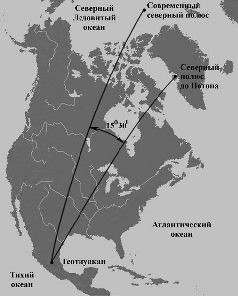 Если же посмотреть на глобус, то можно заметить, что продолжение оси привязки Теотиуакана приводит нас именно в ту область, где предположительно ранее (до Потопа) находился Северный полюс.