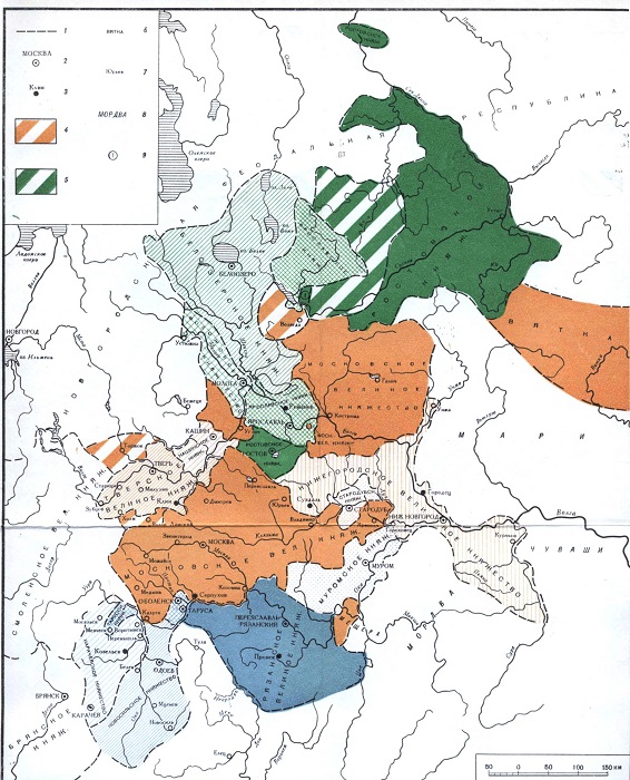 По-иному трактуют эти проблемы летописи времени складывания Русского государства с центром в Москве. До нашего времени не дошел общерусский свод 1418 г., составленный при митрополите Фотии. Мы располагаем Московским сводом 1479 г., где освещены главные проблемы, волновавшие современников. Середина XV в. характеризуется обострением феодальной войны. Она приобретает напряженный характер в связи с тем, что в нее вмешиваются татары, участившие свои набеги на Русь. Положение изменилось только в последней четверти XV в., когда были ликвидированы уделы и пала Новгородская республика. В результате объединения русских княжеств создались предпосылки для ликвидации остатков золотоордынского ига. Ф. Энгельс подчеркнул эту сторону исторического процесса: «… В России покорение удельных князей шло рука об руку с освобождением от татарского ига, что было окончательно закреплено Иваном III»