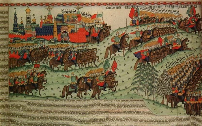 [13]. Особенно важны страницы летописной повести, показывающие организацию общерусского похода против Мамая. Роль организатора похода взял на себя князь Дмитрий. «И съвокупився с всеми князми рускими и с всею силою и пойде противоу их в борзе с Москвы, и хотя боронити своа отчины». Летопись определяет непосредственные силы московского князя в 100 тыс. человек и «опрично» 50 тыс. приведенными другими князьями и воеводами