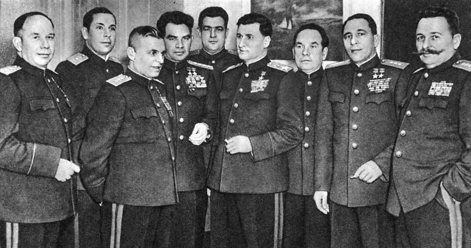 Группа генералов с Маршалом Советского Союза В. Д. Соколовским. Слева направо: Н. Е. Чуваков, М. X. Калешник, В. И. Казаков, В. И. Чуйков, Д. В. Семенов, В. Д. Соколовский, И. П. Петров, М. Б. Катуков, А. И. Шебунин (Потсдам, 1949 год)