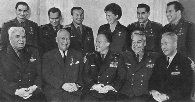 Встреча первых Героев Советского Союза с космонавтами. Сидят: М. В. Водопьянов, М. Т. Слепнев, Н. П. Каманин, А. В. Ляпидевский, В. С. Молоков. Стоят: В. Ф. Быковский, Г. С. Титов, Ю. А. Гагарин, В. В. Терешкова, А. Г. Николаев, П. Р. Попович