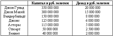 Миллиардер – понятие не только новейшего времени, а прямо наших дней. Средние века, XVI, XVII и XVIII столетия не знали его. Мы слышим, правда, о могущественных банкирских домах той эпохи, например, о еврейско-немецкой фирме Фуггеров, против власти которых, кстати сказать, так горячо предупреждал своих сограждан знаменитый Ульрих фон Гуттен. Но их капиталы сравнительно с грудами золота наших Ротшильдов, Гульдов, Асторов – средневековый приземистый домик перед четырнадцатиэтажными гигантами Нью-Йорка или Чикаго. Просмотрите хотя бы следующую таблицу, посвященную одним лишь американским богачам; кто верит в могущество денег, тот не может не поверить и в могущество миллиардеров: