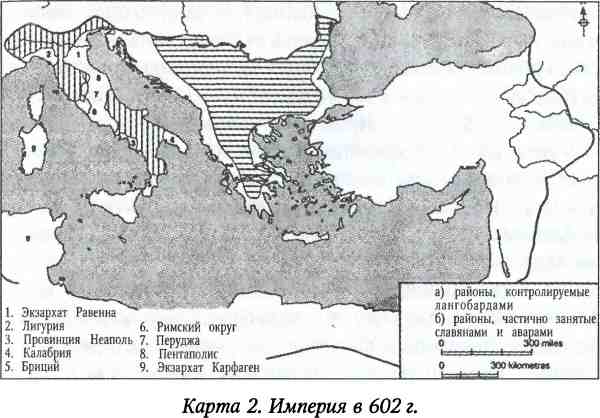 Сократившаяся в размере и обедневшая Восточная Римская, или Византийская, империя была вынуждена теперь не только противостоять новому сильному и чрезвычайно удачливому врагу на Востоке. В ее распоряжении теперь находилось куда меньше ресурсов. Она потеряла контроль над ситуацией на Балканах и реальную власть в Италии, где находившийся в Равенне военный губернатор — экзарх, боролся со все возрастающими трудностями, стараясь сохранить имперскую власть.