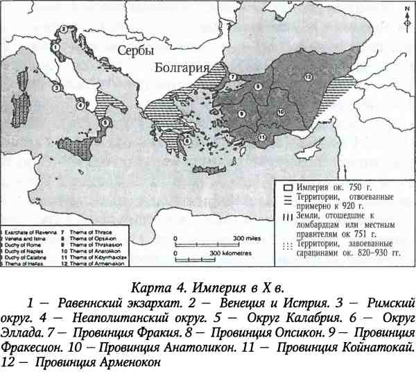 X столетие ознаменовалось для Византийской империи огромными достижениями как в культурном развитии, так и в смысле возвращения большинства бывших римских территорий на Востоке. Эти успехи начались благодаря победам талантливых полководцев при Льве VI (886–912) и Константине VII (912–959) и продолжались в правление «солдатских императоров» Никифора I Фоки (963–969) и Иоанна I Цимисхия (969–976). В эту эпоху в состав империи вошли значительные территории северной Сирии, были разгромлены войска эмиров на западе Междуречья, вновь отвоеваны Крит и Кипр, завоеван район Антиохии и едва не был снова присоединен Иерусалим. Хотя правление Василия II (976–1025) началось гражданской войной и поражением на Балканах, но и при нем продолжалось в целом восстановление и консолидация Византийской империи, и после продолжительной и тяжелой войны ему удалось разгромить Болгарское царство. Земли болгар были включены в состав империи и разделены на провинции, находившиеся под их собственным управлением. Дунай снова превратился в северную границу империи, а на Востоке эмират Алеппо и соседние с ним эмираты стали данниками Византии. Там ее соперником стал Египет, управляемый династией Фатимидов, которая также пыталась осуществлять экспансию в Сирии.