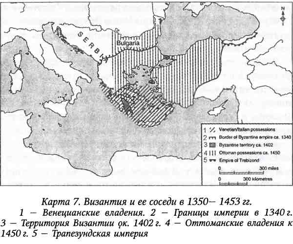 Как и другие государства, Восточная Римская империя на протяжении своего существования боролась за сохранение территориальной целостности. Величайшую ее проблему составляло само географическое положение, так как Византия постоянно была окружена потенциальными и реальными врагами. На востоке это была Сасанидская Персия (до 620 г.), затем исламский халифат, наконец, турки — сельджуки и оттоманы; на севере — различные переселявшиеся племена славян (VI–VII вв.) и кочевые народы (авары, булгары, хазары, венгры (мадьяры) и др.); в западном прибрежном районе Балкан — лангобарды, франки, а позднее — сарацины (из Северной Африки и Испании) и норманны (с конца X в. до сер. XII в.). Наконец, с XII в. морские государства Италии также стремились, по возможности, подчинить своему влиянию византийских императоров и территорию империи. Излишне амбициозные (хотя первоначально оказывавшиеся довольно удачными) планы вернуть утраченные имперские земли в сочетании с ограниченной и недостаточно гибкой бюджетной системой стали ключевыми факторами, определившими историю империи. Начиная с XI в. византийская экономика постепенно уступала быстро крепнувшей экономике стран Западной Европы, в особенности государств Италии. Взятие и разграбление крестоносцами Константинополя в 1204 г. в результате Четвертого крестового похода и последующий раздел ее территории между рядом латинских княжеств и Латинской империей ознаменовало закат Византийской империи как влиятельной международной силы. Хотя в 1261 г. Константинополь вновь обрел имперский статус, быстрый рост балканских держав (таких, как Сербия) и турецкая экспансия в Анатолии и впоследствии на Балканах лишали Византию реальных шансов на восстановление своего могущества в регионе. Перед окончательным поглощением империи оттоманским государством она состояла лишь из области, прилегающей к Константинополю, нескольких эгейских островов и южной части греческого Пелопоннеса.