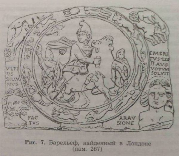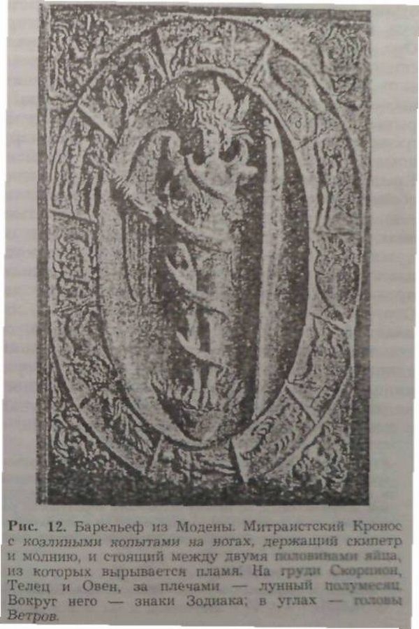 Добавим, что еще сравнительно простым вариантом этого типа является композиция, в которой Митра, солнечный бог, предстает в окружении одних только знаков Зодиака, бюстов Ветров и Времен Года, то есть космических символов. Два наиболее примечательных памятника такого рода были, что любопытно, открыты в двух крайних точках римского мира, один — в Сидоне в Финикии (с. 161), а другой — в Лондоне (с. 79). Но этот тип был, без сомнения, также распространен, во всяком случае, в некоторых промежуточных областях [34].