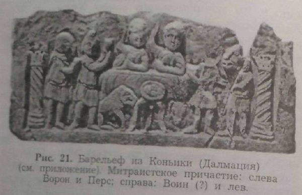 В маздеистском богослужении жрец освящал хлебы и воду, которую смешивал с приготовленным им пленительным соком Хаома, и использовал эту пищу в ходе жертвоприношения[33]. Эти древние обряды сохранились и в митраистских церемониях посвящения; с той единственной разницей, что Хаома, растение неизвестное на Западе, заменялся виноградным соком [34]. Перед участником мистерии клали хлеб и ставили чашу, наполненную водой, над которой жрец произносил священные формулы. Такое причащение хлебом и водой, к которой, несомненно, примешивали затем вино, сравнивается церковными писателями с христианским причастием[35]. Как к таковому, к нему допускали только после длительного периода ученичества. Возможно даже, что только посвященные, достигшие степени «Львов», имели право принять его, и именно по этой причине им давали наименование «Участников». Один любопытный барельеф из Далмации демонстрирует нам эту священную трапезу (рис. 21).