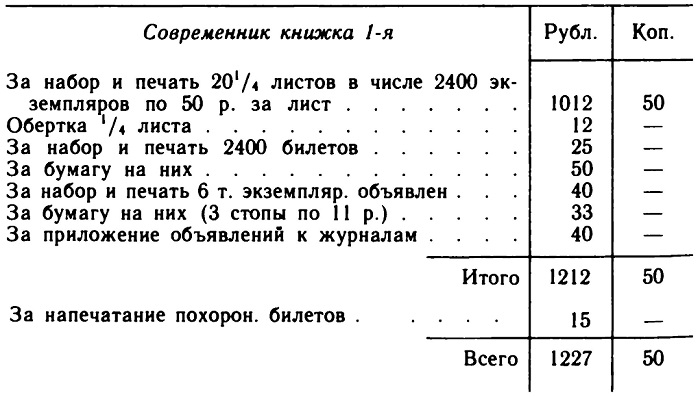 Первый том «Современника», вышедший 3 апреля 1836 г., имел тираж 2400 экземпляров; второй (3 июля) — тоже 2400; третий (28 сентября) — уже 1200; последний (22 декабря) — только 700. Общий расход на бумагу, типографские работы и гонорар авторам, который Пушкин платил первоначально из собственного кармана, составили приблизительно как раз 25000. На квартире поэта после его смерти осталось 109 полных комплектов журнала (их потом продали) да еще неизвестно сколько отдельных экземпляров первого и второго номеров — Опека над детьми и имуществом А. С. Пушкина постановила их сжечь, не надеясь реализовать; по этим данным нетрудно будет подсчитать барыши поэта. Необходимо, конечно, при этом знать, что годовой комплект «Современника» стоил 25 руб. ассигнациями, а «с пересылкою» — 30 руб.