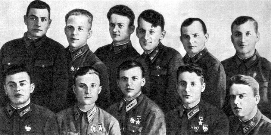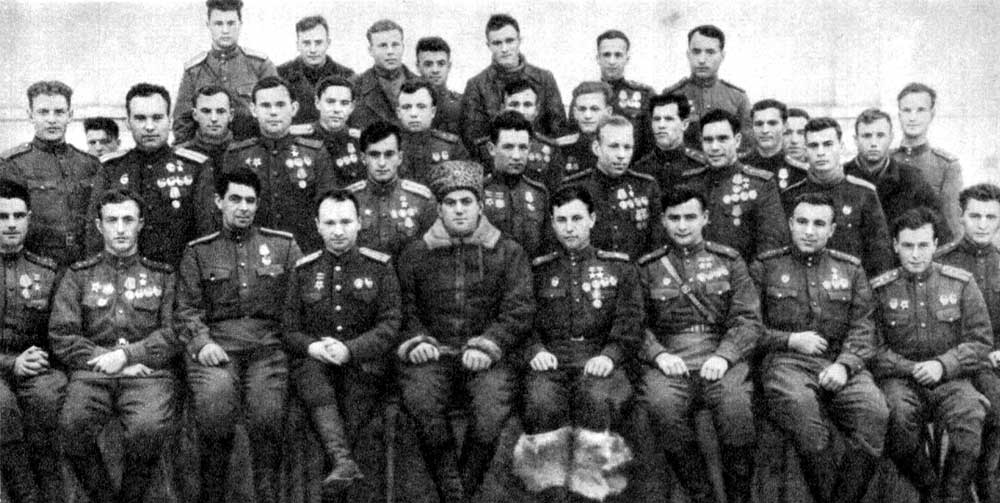 Герои Советского Союза 9-го ГИАП. Слева направо: Александр Карасев, Владимир Лавриненков, Иван Королев, Аркадий Ковачевич, Анатолий Морозов, Алексей Алелюхин, Амет-Хан Султан, Иван Борисов, Павел Головачев (1943)