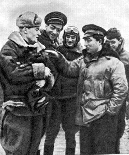 Слева направо: авиатехник Я. Пеньковский, замкомэска А. Аристархов, авиатехники Н. Бутов, И. Слюсарев, комэск Амет-Хан Султан и комсорг полка Д. Кацин.