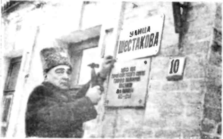 Дважды Герой Советского Союза В. Д. Лавриненков прикрепляет к дому своего фронтового командира табличку с новым названием улицы. Январь, 1974 г.