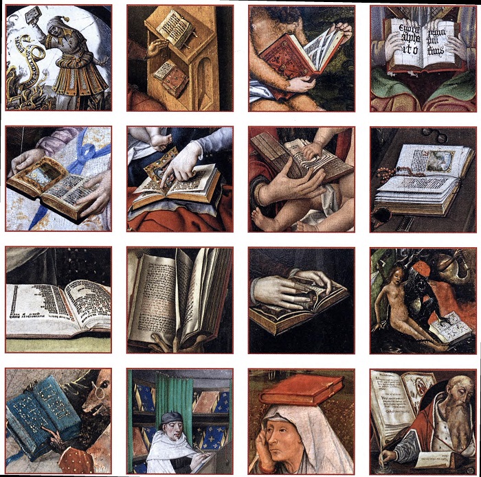 Ведь в Евангелии от Иоанна (1:14) он был назван Словом, которое облеклось плотью. Книга — не только атрибут Бога. На бессчетных средневековых образах евангелисты держат в руках свои Евангелия, богословы — написанные ими трактаты, а основатели монашеских орденов — созданные ими уставы… Но чаще книга в руках святого — это не конкретное сочинение, а знак его духовного авторитета, права толковать священные тексты и наставлять паству. Помимо священных книг, средневековые мастера изображали и те, что считались пагубными: ложные писания еретиков, сочинения иноверцев или колдовские гримуары. Сцены, в которых мы видим такие книги, почти всегда создавались для обличения религиозных девиаций, поэтому в иконографии подобные книги обычно кидают в костер или рвут на куски. У Иеронима Босха в «Искушении св. Антония» среди множества демонов, которые осаждали пустынника, есть бес-священник. Он водит пальцем по страницам синей книги — пародии на богослужебные рукописи. Нa многих изображениях книг можно разобрать текст. Когда кодекс, нарисованный на фреске или книжной миниатюре, был слишком мелок или находился слишком далеко, чтобы его разобрать, либо если суть послания была не важна, средневековые мастера рисовали ряды завитков и черт, имитирующих строки. А представляя пагубные книги иноверцев, они порой копировали настоящее еврейское или арабское письмо, но чаще лишь стилизовали под них псевдобуквы.