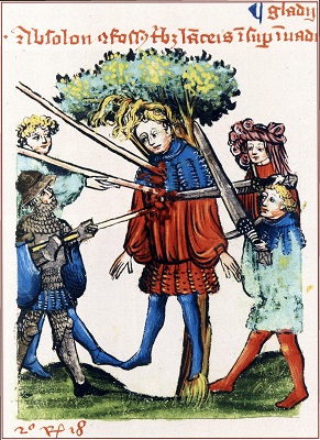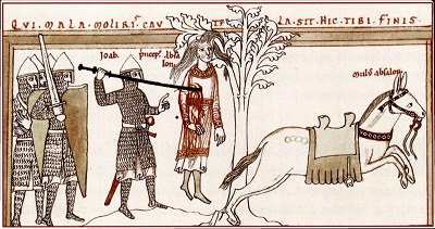 Смерть Авессалома, сына царя Давида. Он поднял против отца мятеж, был разбит и, когда пытался спастись, запутался длинными волосами в ветвях дуба, и его закололи (2 Цар. 18:9–16). Сверху, над рамкой, идет нравоучительный комментарий к этой истории: «Qui mala moliris cautela sit hic tibifinis» — «Замышляющий такую подлость, берегись — вот конец, который тебя ожидает». А внутри миниатюры зрителю разъясняют, кто перед ним: «Иоав», «принц Авессалом», «мул Авессалома».