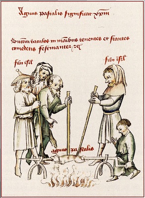 Древние евреи жарят пасхального агнца, который, как сказано над фигурами, означает Христа. На миниатюре подписаны и «сыны Израилевы», и сам «агнец пасхальный». В тексте «Зерцала» эта сцена предстает как один из ветхозаветных прообразов Тайной вечери — пасхальной трапезы, в ходе которой Иисус установил таинство евхаристии.