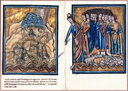 Затертый инцест. В 19-й главе Книги Бытия рассказывается о том, что после уничтожения Содома и Гоморры дочери праведника Лота, сочтя, что на земле больше не осталось мужчин, решили опоить отца и с ним переспать, чтобы родить потомство. «И вошла старшая и спала с отцом своим [в ту ночь]; а он не знал, когда она легла и когда встала. На другой день старшая сказала младшей: вот, я спала вчера с отцом моим; напоим его вином и в эту ночь; и ты войди, спи с ним, и восставим от отца нашего племя. И напоили отца своего вином и в эту ночь; и вошла младшая и спала с ним; и он не знал, когда она легла и когда встала. И сделались обе дочери Лотовы беременными от отца своего» (Быт. 19:33–36). От сыновей, которых они родили, произошли моавитяне и аммонитяне. На этой миниатюре, как и на многих аналогичных средневековых изображениях, кто-то, стремясь скрыть инцест, замазал фигуры Лота и его дочерей.