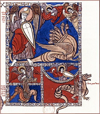 В одном английском Апокалипсисе XIV в. мы видим странную сцену: слева в воздухе, прижавшись ногами к рамке, висят два человека, которых пожирает какой-то монстр в короне. Правее они же стоят, обратив взоры на рушащийся город, а сверху они возносятся на небеса. Вернее, их тела уже скрылись в облаке, и в кадре остались только полы одежд и босые ступни [3]. Это два «свидетеля», которые, как сказано в 11-й главе Откровения Иоанна Богослова, в конце времен будут в течение 1260 дней проповедовать, облачившись во вретища. В средневековой традиции их чаще всего отождествляли с пророками Илией и Енохом, которые выступят против Антихриста. «И когда кончат они свидетельство свое, зверь, выходящий из бездны [т. е. сам Антихрист], сразится с ними, и победит их, и убьет их, и трупы их оставит на улице великого города, который духовно называется Содом и Египет, где и Господь наш распят». Но три с половиной дня спустя в них войдет «дух жизни от Бога», они восстанут и, по повелению небесного гласа «взойдите сюда», в облаке вознесутся на небо. И тогда случится «великое землетрясение», и десятая часть города рухнет. На миниатюре вся эта череда событий показана в одном кадре. Потому фигуры убитых, воскресших и возносящихся «свидетелей» повторяются трижды. Время сгущается в симультанную композицию (в англоязычной литературе такой прием часто называют