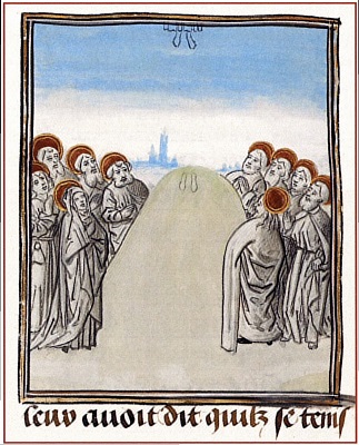 И они сказали друг другу: не горело ли в нас сердце наше, когда Он говорил нам на дороге и когда изъяснял нам Писание (Лк. 24:30-32). Хотя в евангельском тексте нет ни слова о том, что Христос в Эммаусе вознесся на небеса, его исчезновение на этой миниатюре предстает именно как вознесение. А разговор апостолов между собой — как скрещение пергаменных лент, которые, словно не зная о силе тяжести, устремляются вверх. Здесь они оставлены пустыми. Однако на тысячах других средневековых изображений на таких лентах (по-английски их принято называть
