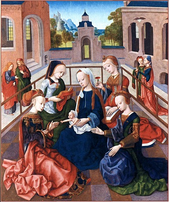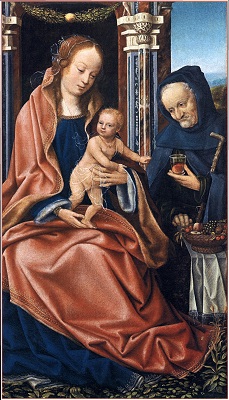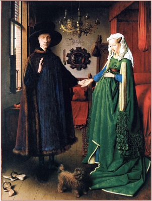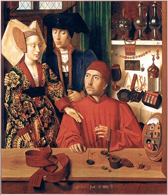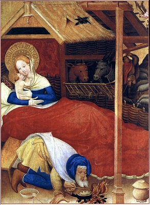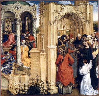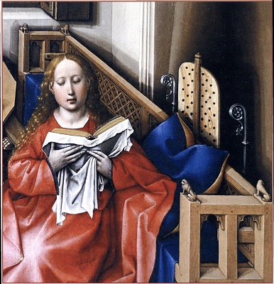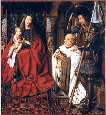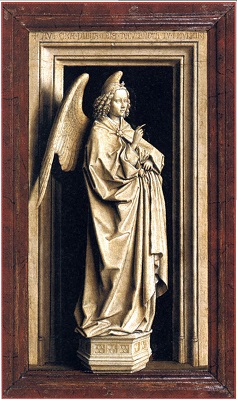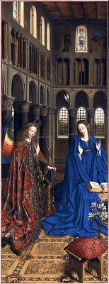 «скрытой» символики, которое некогда было предложено Эрвином Панофским. Робер Кампен, Ян ван Эйк, Рогир ван дер Вейден и мастера следующих поколений часто стремились дать религиозным символам, которые они вводили в сакральные сцены, какое-то реалистическое и повседневное обоснование. Например, на изображениях Благовещения лилия, олицетворявшая безупречную чистоту Девы Марии, ставилась в вазу, которую помещали на стол или в угол комнаты. Если не знать, что лилии вот уже несколько веков постоянно фигурировали в иконографии Благовещения, ее можно принять просто за украшение интерьера. Однако не столь известно, что такая «рационализация» символики порой касалась и знаков, по которым зритель узнавал дьявола, а также рогов, с какими с XI в. представляли пророка Моисея. На триптихе Мероде, который хранится в нью-йоркском музее «Клойстерс», Робер Кампен или кто-то из его учеников изобразил, как Иосиф, престарелый муж Девы Марии, сверлит дырки в какой-то доске, а рядом с ним стоит