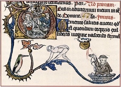 Этот прием нам сегодня прекрасно знаком. В современных комиксах и графических романах персонажи переговариваются друг с другом с помощью реплик, записанных в «облачках» («бабблах», «баллонах») разных форм. Обычно они исходят из уст говорящих и парят в воздухе рядом с ними. С помощью таких «облачков» можно передать не только речь, но и внутренний монолог персонажей. Глядя на белые контуры, заполненные буквами, зритель тотчас же понимает, что перед ним не какой-то реальный предмет, существующий в изображенном мире, а условный знак — своего рода доска для записи. Иcтoрия «бабблов» начинается в Средневековье, когда образ и текст, видимо, переплетались теснее, чем в искусстве Античности или Возрождения. На средневековых мозаиках, фресках, алтарных панелях и особенно книжных миниатюрах в визуальное пространство встраивается множество разных подписей. Одни слова плывут по фону вокруг персонажей, другие начертаны на различных предметах: страницах книг, развернутых свитках, нимбах святых, полах одежд, — которые изображены в кадре. Буквы вплетаются в образ, но и образы часто помещают внутрь букв. Инициалы заключают фигуры (от ветхозаветных пророков и христианских святых до звероподобных демонов и фантастических гибридов) и целые сцены, а порой сами буквы складываются из сплетенных или гротескно изогнутых человеческих или звериных тел