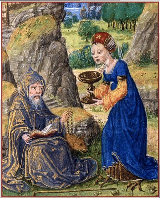 [5]. Здесь фон, на котором разворачивается действо, выглядит предельно условно, а фигуры странным образом пересекаются в воздухе. Даже если не знать о существовании подобных примеров, зритель вряд ли решит, что на миниатюре изображены три пары летающих близнецов. Однако бывают симультанные образы, которые выглядят намного естественней. И потому современному зрителю, который привык к классической живописи, стремящейся соблюсти единство пространства и времени, прочитать их уже не так просто. На одной алтарной панели из Каталонии мы видим Августина Блаженного (354–430), который сидит за книгой в своей келье-«кабинете» [4]. Сцена, открывающаяся за окном, — это не вид, который он мог бы увидеть, если бы повернул голову, а один из эпизодов его жития, где он сам же и действует. Однажды во время прогулки он размышлял о Троице и увидел ангела в облике младенца, который ложкой вычерпывал воду из моря в ямку, проделанную в песке. На вопрос, что он делает, тот отвечал, что попытки постичь человеческим разумом природу триединого божества столь же бесплодны, как и это занятие. На алтарной панели фигура св. Августина повторяется дважды (в келье и вдали), а вид из окна оказывается условным приемом, который позволяет включить в основную сцену дополнительный эпизод-комментарий. Таких принципов, которые чрезвычайно важны для понимания средневековых изображений, можно вспомнить немало. В сборнике житий, созданном в Париже во второй четверти XIII в., в одном из инициалов изображен город, а в нем толпа черноликих людей в островерхих шапках. Из-за стен к ним обращается бородатый святой, который изображен выше, чем крепостная башня