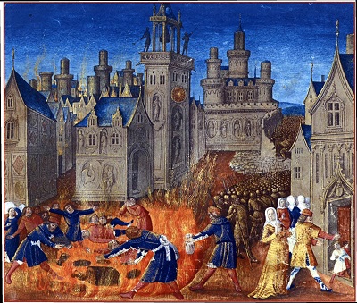 Анахронизм, смешение времен или изображение прошлого как вечного настоящего — одна из известных черт средневекового искусства и исторического сознания. Однако где-то он, вероятнее всего, был стихийным (мастера не знали и чаще всего не могли знать, как выглядели древние города, доспехи или другие реалии), а где-то использовался осознанно и просчитанно. Нам предстоит разобраться, зачем. Одно из средневековых изобретений, которое воображение мастеров переносило в прошлое, — это