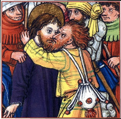[9]). С обеих сторон, слегка развернувшись к нему, сидят апостолы, а где-то в углу или на противоположной стороне стола оказывается Иуда Искариот — будущий предатель. И он, единственный из собравшихся, показан в профиль [5]. В Позднее Средневековье Иуду, как и других грешников, иноверцев и еретиков, часто представляли утрированно безобразным. Уродство черт должно было продемонстрировать его внутреннюю порочность и вызвать у зрителя ненависть к архизлодею, который продал Спасителя. Один из главных «атрибутов» Иуды (и иудеев), который тогда применялся в иконографии Страстей, — хищный, загнутый крючком нос. А он, конечно, был лучше виден, когда злодея изображали в профиль